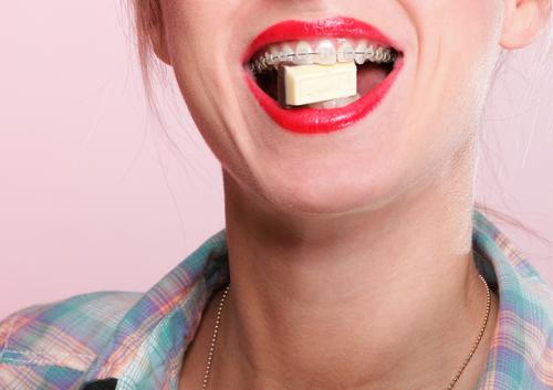 - All chewy, gooey candies need to be avoided. When you’re wearing braces, don’t even think about putting a caramel candy in your mouth. Caramel will not only stick to your braces, making it look as if you haven’t brushed your teeth in a week, but the gooey texture can pull apart the wires, and trigger an emergency visit to Fredericksburg Dental Artists.